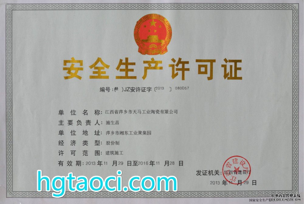 圖為江西省萍鄉(xiāng)市承雨化工陶瓷有限公司的安全生產(chǎn)許可證