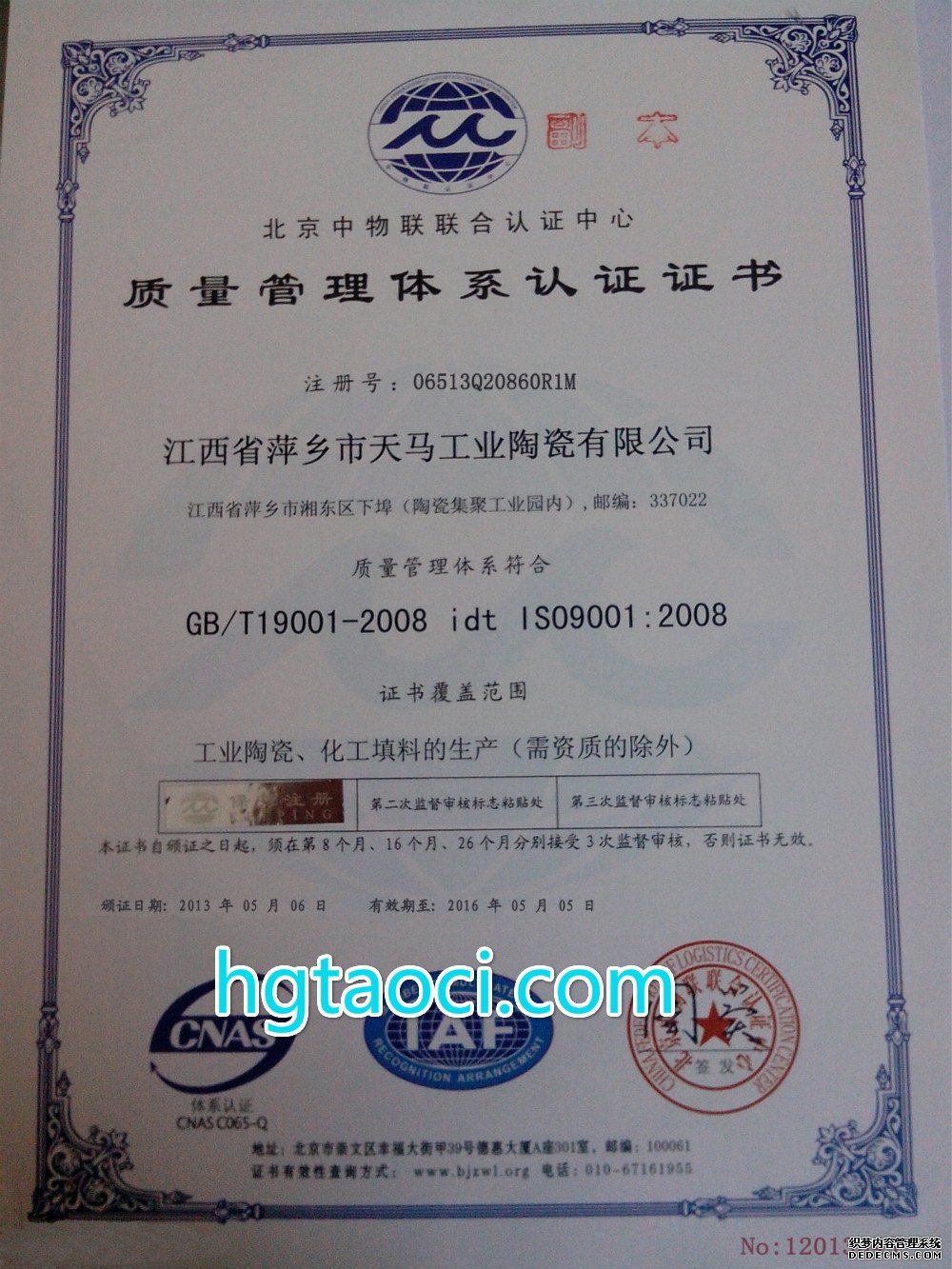 證書覆蓋范圍:工業(yè)陶瓷、化工填料的生產(chǎn)。