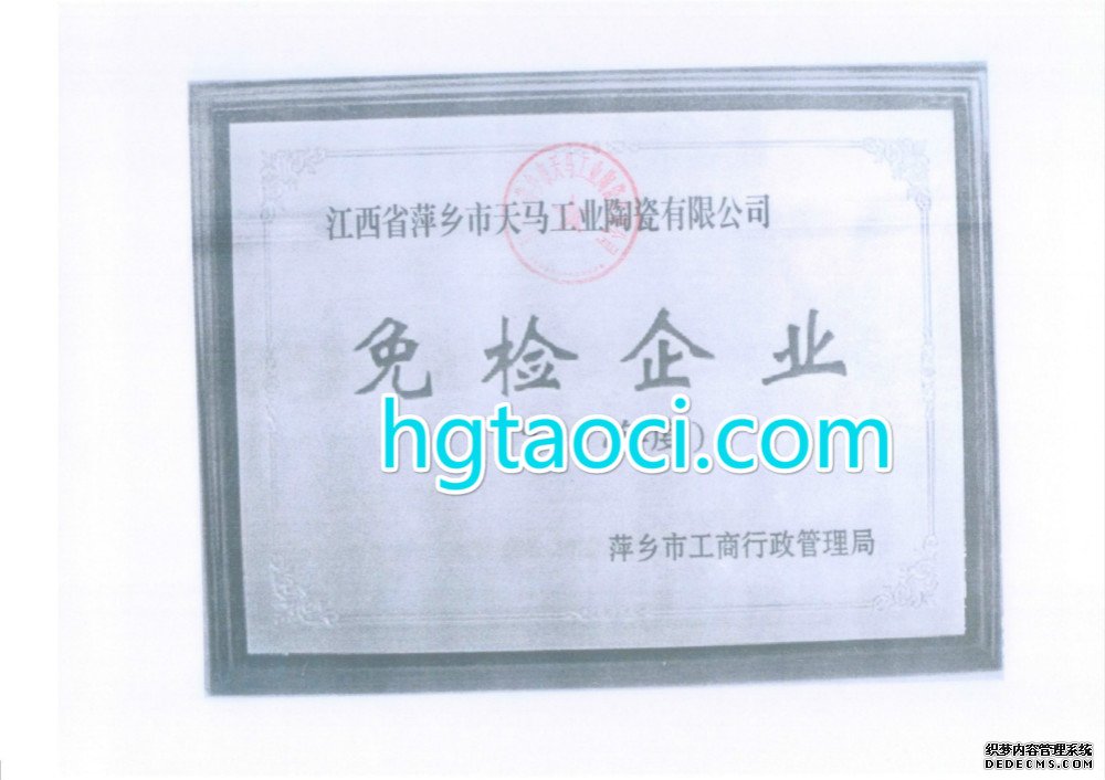 圖為江西省萍鄉(xiāng)市承雨工業(yè)陶瓷有限公司的免檢企業(yè)證書(shū)。