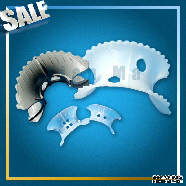 塑料異鞍環(huán)填料類似于馬鞍形狀,是在矩鞍環(huán)填料的基礎(chǔ)上加以改進(jìn)的新型填料,將矩鞍填料的平滑弧形側(cè)面改為鋸齒形或紋紋凸起的側(cè)面。這樣在填料床層內(nèi),增加了填料間接觸的空隙,使之更有利于氣體和液體在填料層中的流動(dòng)和分散,具有壓降低,傳質(zhì)效率高等特點(diǎn)。