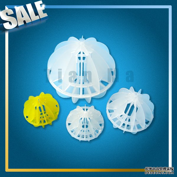 采用聚丙烯(PVC)塑料材質(zhì)制成球形狀,由兩個(gè)半球合成一個(gè)球形,每個(gè)半球上開(kāi)有12個(gè)半扇形葉片,兩個(gè)半球的扇形葉片相互錯(cuò)開(kāi)。該填料特點(diǎn)是比表面積大,空隙率較高。但是由于葉片數(shù)偏多,彼此間有遮蔽效應(yīng),不利于液體分布和潤(rùn)濕;液體大多在球體空心柱聚集,阻礙氣體暢通,因此阻力較大。此種填料多用于水處理工程。